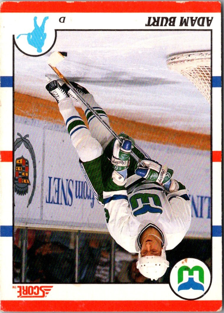 Adam Burt was an integral part of the Hartford Whalers from 1986 to 1993, and this classic 1990 Score card captures him in all his glory. The glossy finish and full-color design showcase the team colors and Burt's recognizable face. This card features Burt in his classic Whalers uniform with a determined expression on his face, ready to take on any challenge. It's a must-have piece of memorabilia for any Whalers fan, offering a nostalgic reminder of a beloved player who embodied the team's spirit. Add this card to your collection and relive the glory of the Hartford Whalers.