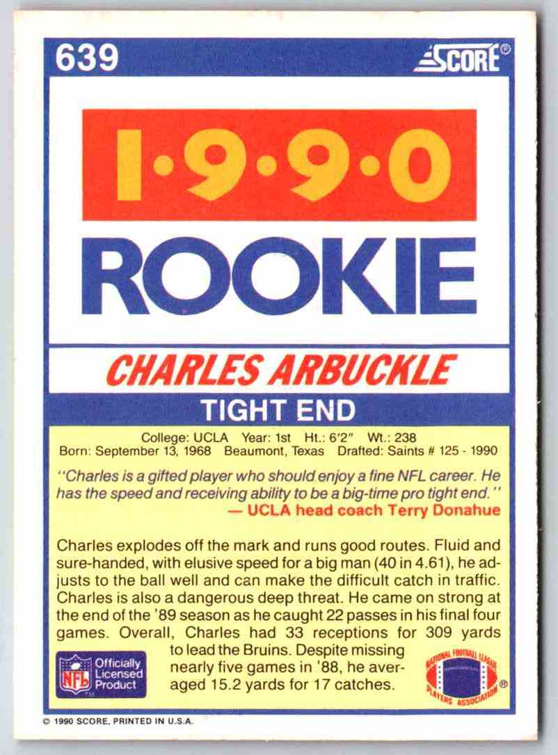 Relive the magic of 1990 Score Football with this classic card of Charles Arbuckle! This card features a great color action shot of Arbuckle, and is graded in Near Mint condition. Get your hands on this card and add it to your collection today!