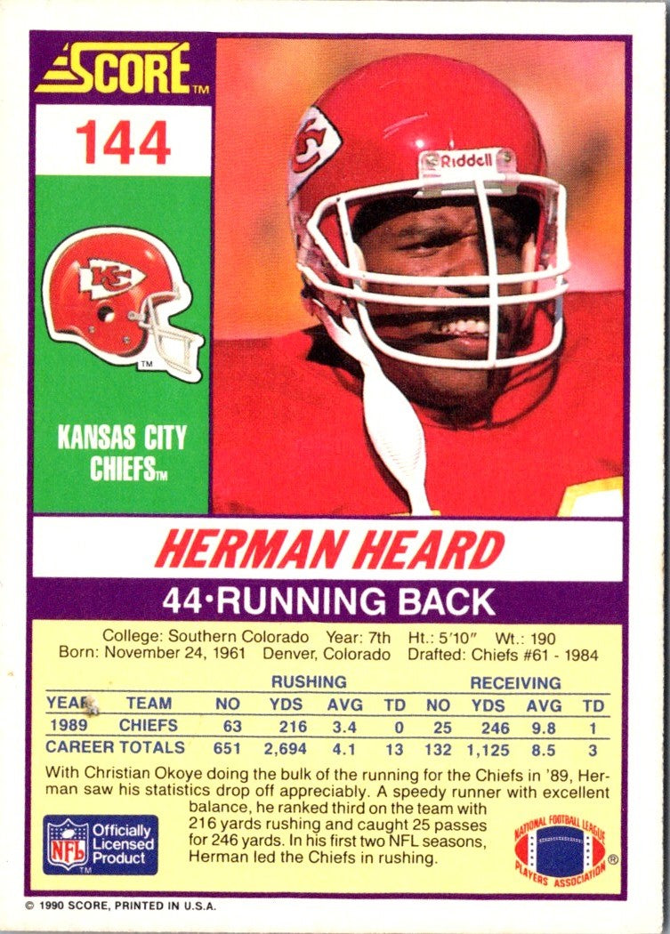 This 1990 Score Herman Heard #144 Kansas City Chiefs card is a must-have for any Chiefs fan. Featuring a full-color photo of the legendary running back, this card is perfect for any collection. Show off your team spirit with this classic card from one of the greatest football franchises in history!