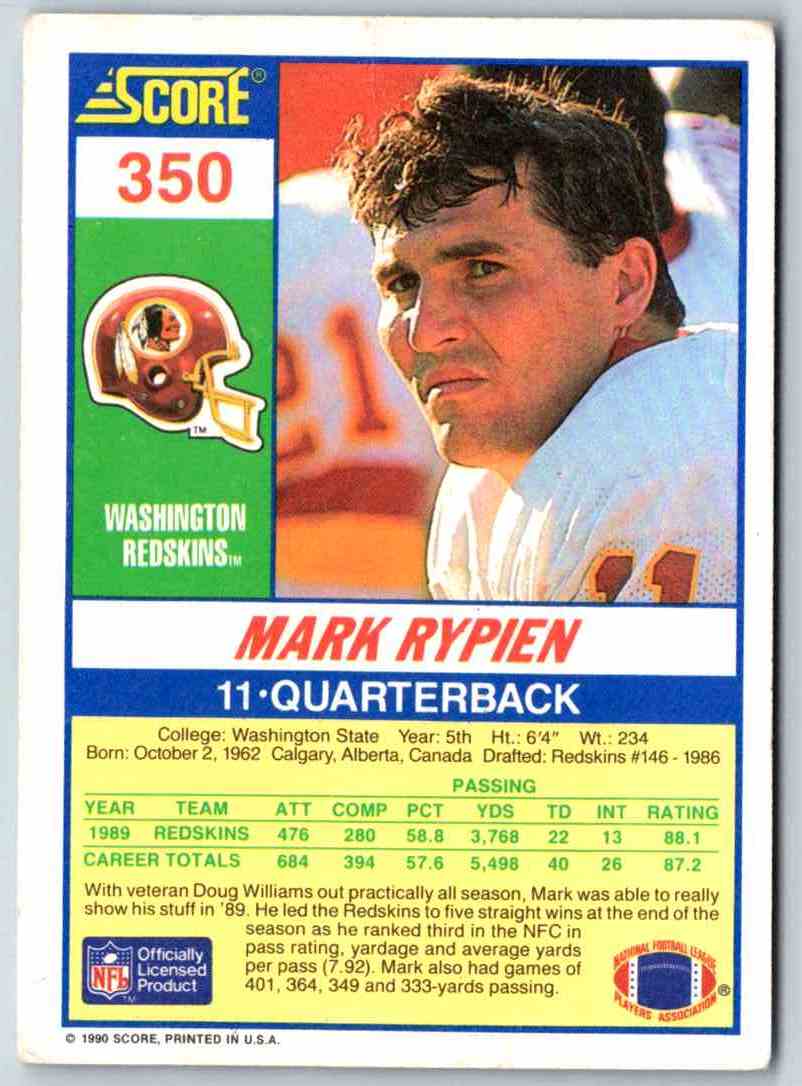 The 1990 Score Mark Rypien #350 card offers an impressive collectible for any football fan. Featuring a clear, full-colour photo of Rypien in action, the card is a great way to commemorate the career of the two-time Pro Bowler. The back of the card provides a detailed biography of Rypien's career, making it a must-have for any fan of the Washington Redskins. With this card, you'll be able to bring the gridiron legend into your home and closer to your heart.