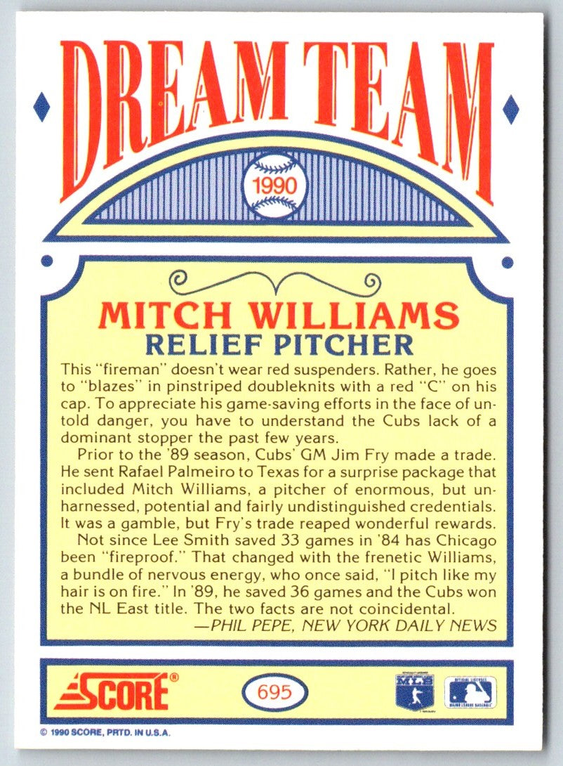 Mitch Williams was an incredible pitcher for the Chicago Cubs in 1990 and his card is a must-have for any collector! This 1990 Score Mitch Williams #695 card is in pristine condition and shows off his signature pitching style. It features a full-color image of Williams pitching in his classic blue and red Cubs uniform. The card back includes his stats from the 1990 season as well as a brief biography of his career. Own a piece of baseball history with this 1990 Score Mitch Williams card!