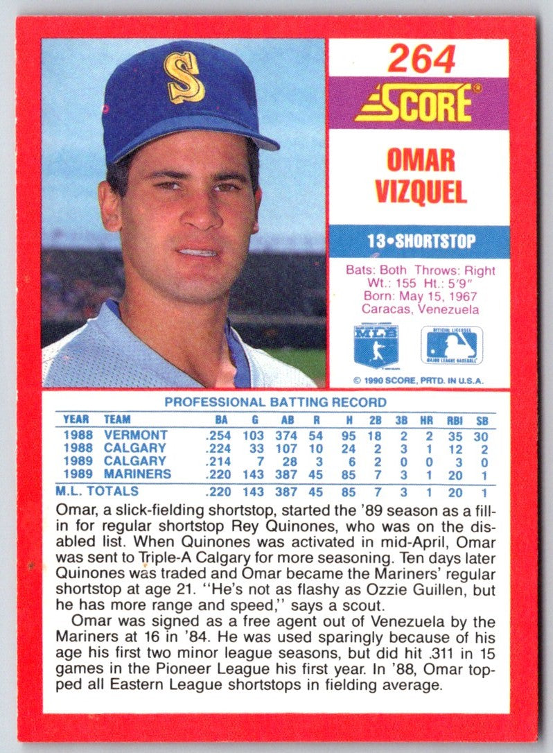 This 1990 Score Omar Vizquel #264 Seattle Mariners card is the perfect addition to any Mariners fan's collection. Perfectly preserved, this card shows the Hall of Fame shortstop in his Mariners uniform at the peak of his career. This card shows Vizquel in mid-swing, ready to send the ball deep into the outfield. This card is sure to be a great addition to your Mariners collection.