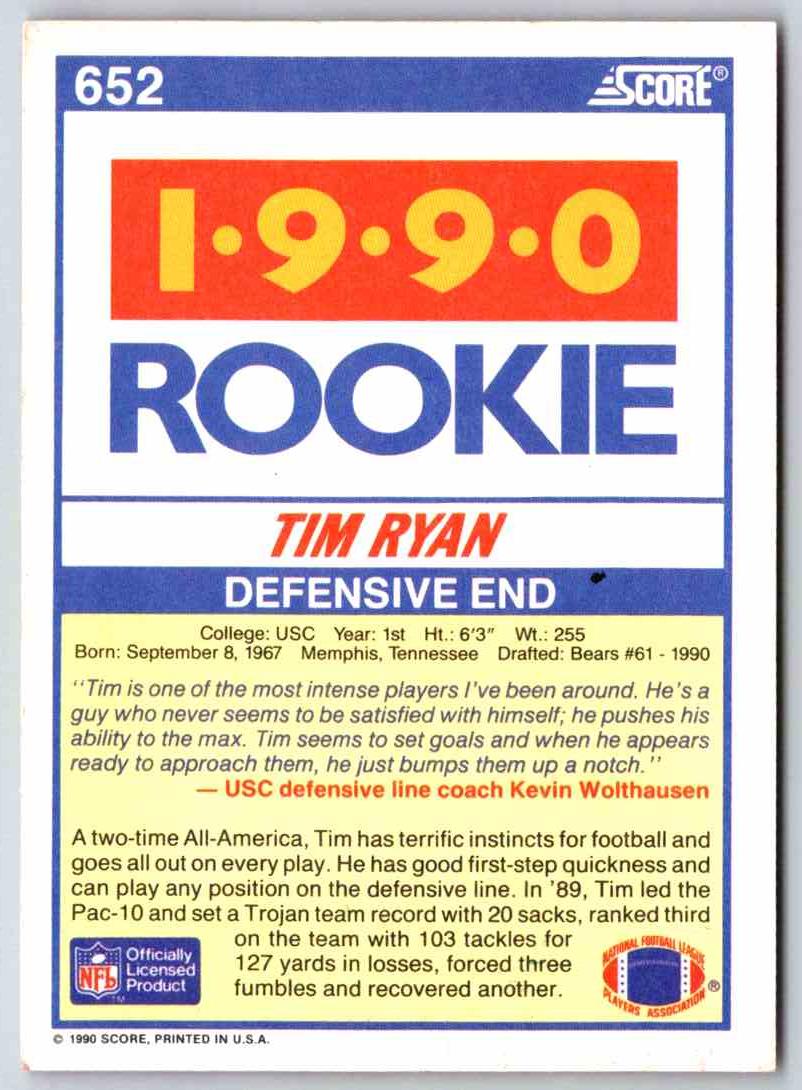 1990 Score Tim Ryan #652 is a classic, collectible card featuring the beloved Tampa Bay Buccaneers quarter back. This card is in mint condition, featuring an action shot of Ryan throwing a pass. The card's unique design will make it stand out among your collection. It also features detailed stats and information about Ryan's impressive career in the NFL. With this card, you can celebrate the career of one of the most iconic players in Buccaneers history. Add it to your collection today!