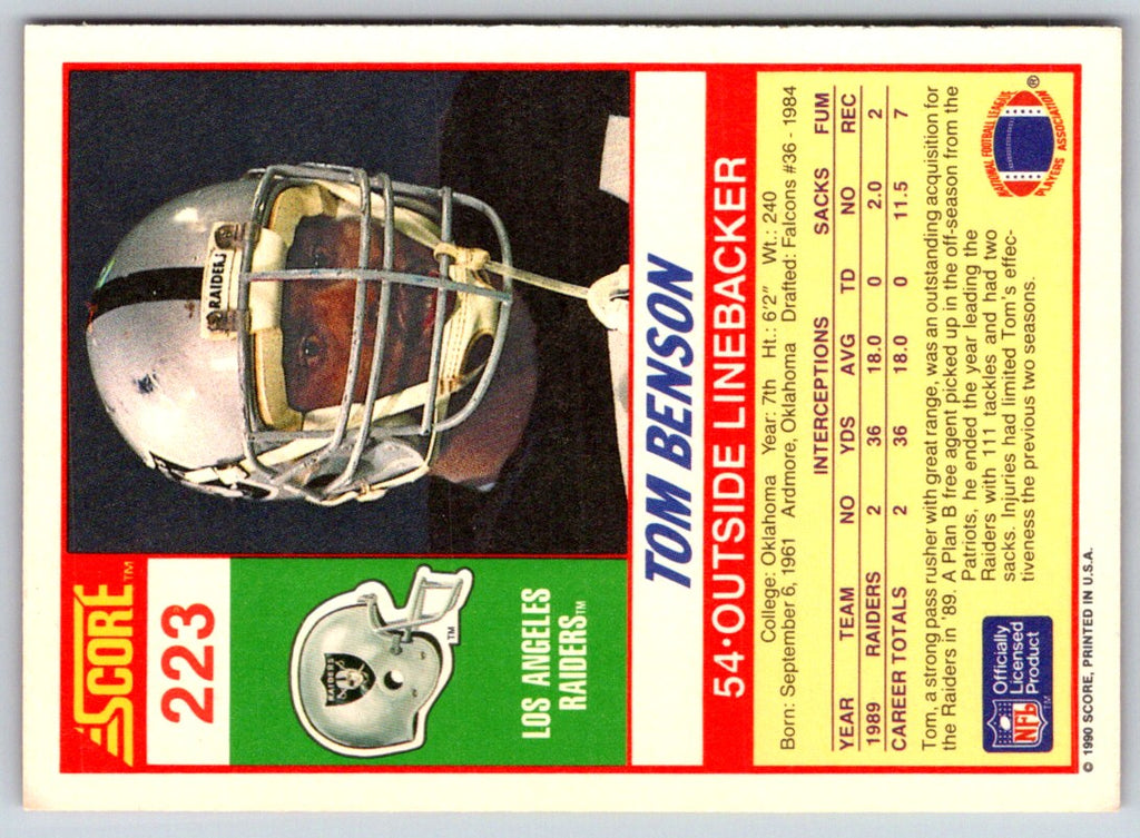 Tom Benson #223 is a must-have for all Raiders fans and sports card collectors! This classic card features a full-color photo of Tom Benson in action for the Los Angeles Raiders, with his name and number printed in bold red and black letters. This card captures the spirit of the 1990 season and will be the perfect addition to any collection!