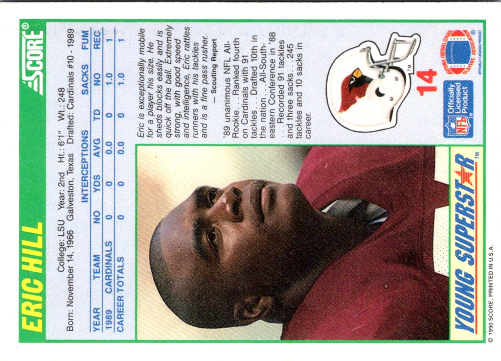This 1990 Score Young Superstars Eric Hill #14 Phoenix Cardinals card is a must-have for any serious NFL collector. Featuring a full-color picture of Hill in his Cardinals jersey, this card is sure to be a standout in your collection. Whether you're building a complete set or just looking for a great addition to your collection, this card is a must-have. Get your hands on this piece of NFL history today.