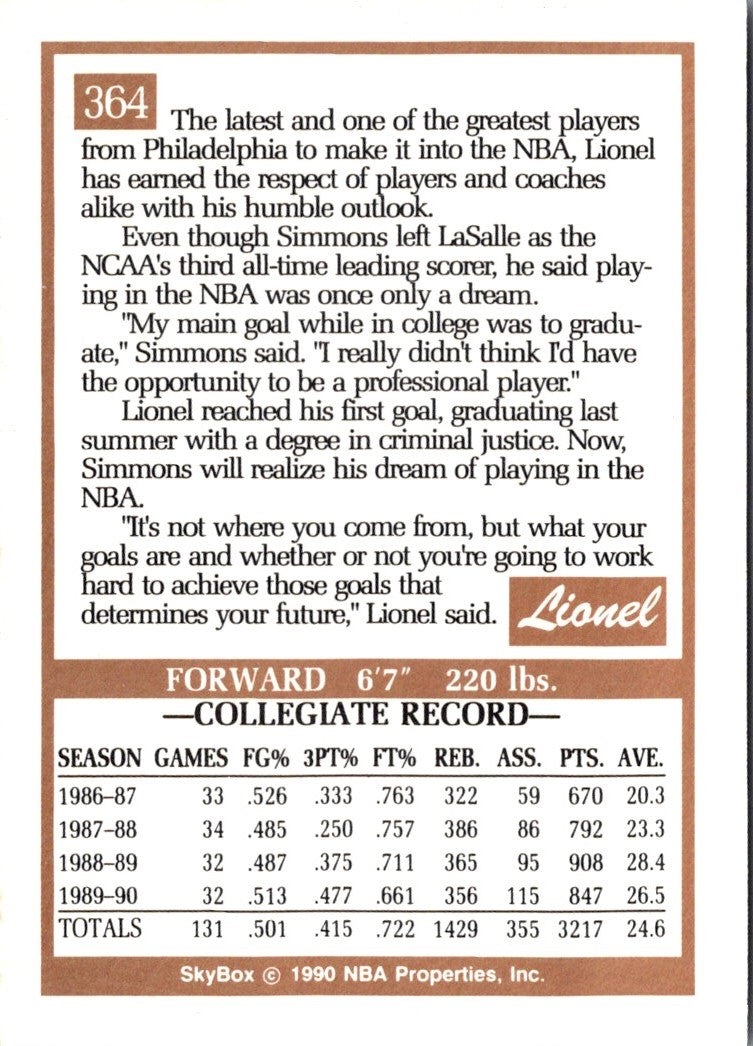 Description: 1990 SkyBox Lionel Simmons #364 Rookie