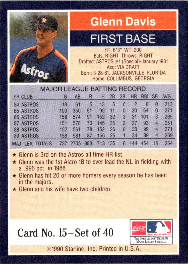 This 1990 Starline Long John Silver Glenn Davis #15 Houston Astros trading card is the perfect addition to any Astros fan's collection. Featuring a full-color headshot of Davis, this card is sure to become an instant classic in your collection. The back of the card features Davis' career stats and a brief bio, giving you a glimpse into one of the Astros' all-time greats. Add this card to your collection today and show your Astros pride!