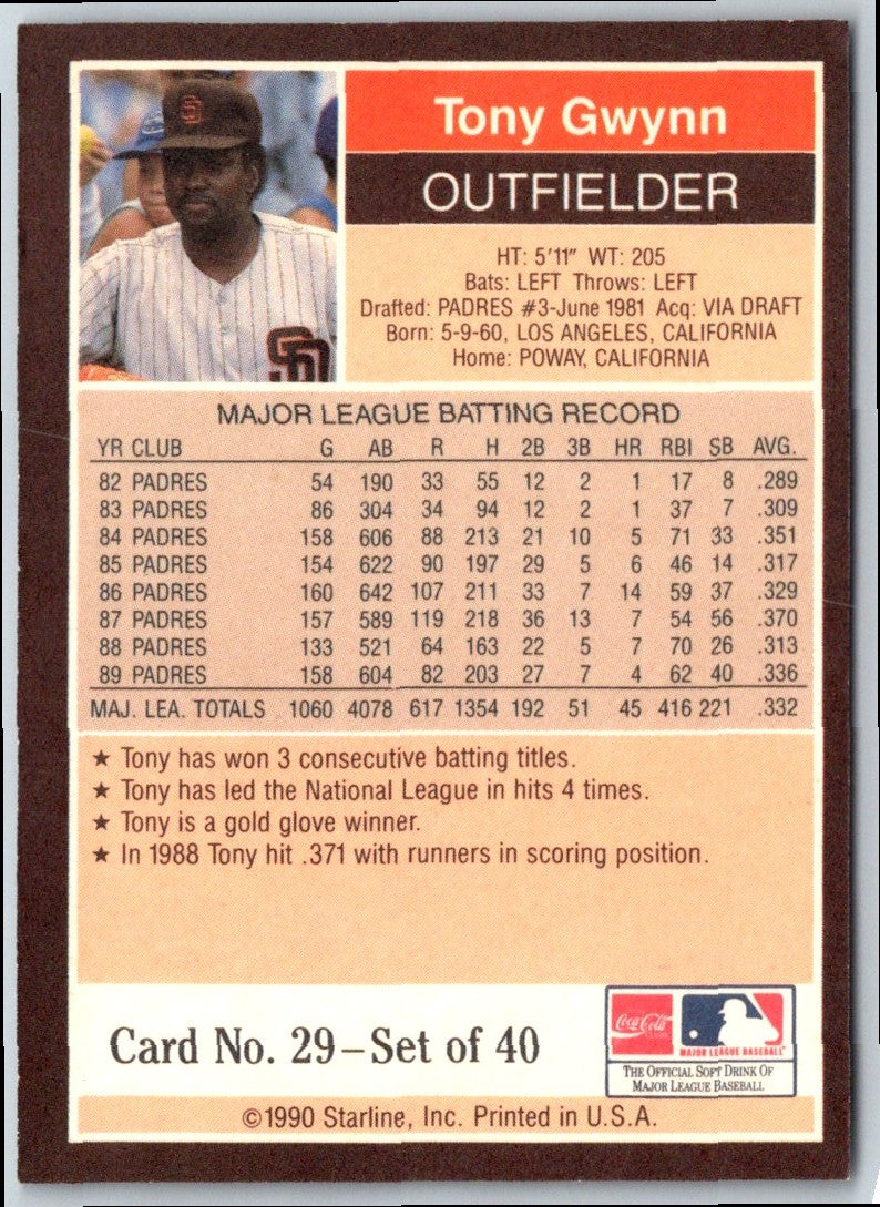 This 1990 Starline Long John Silver Tony Gwynn #29 San Diego Padres card is an absolute must-have for any Padres fan! Show your support for the Hall of Famer with this card that features Gwynn in full Padres uniform. The card captures Gwynn in an action pose, and is sure to be a great addition to any collection. Get your piece of Padres history today!