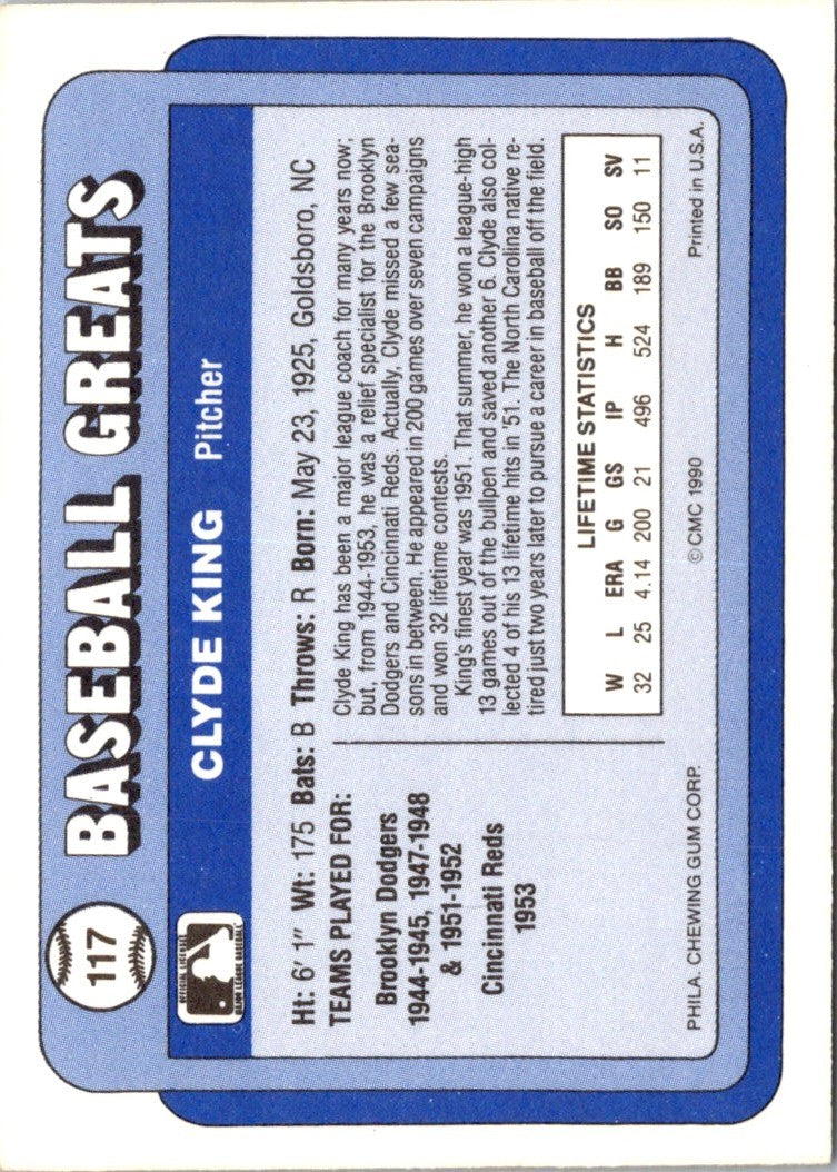 This 1990 Swell Baseball Greats Clyde King #117 Brooklyn Dodgers card is an essential for any collector. With its classic design and crisp colors, this card will be a great addition to any collection. Featuring a portrait of King in the iconic Dodgers uniform, this card is perfect for any fan of the team or of King himself. The reverse side of the card contains King's career stats, making it a perfect way to remember one of the greatest baseball players of the 1990s. Don't miss your chance to add this card to your collection today!