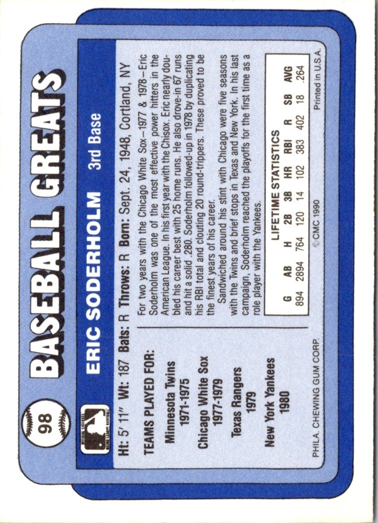 This 1990 Swell Baseball Greats Eric Soderholm #98 Minnesota Twins card is the perfect addition to any MLB fan's collection. Featuring a vibrant action shot of Soderholm in his Twins gear, this card captures the iconic outfielder in all his glory. With a detailed bio and stats printed on the back, this card is a must-have for any baseball fan. Show your support for the Twins and add this fantastic Eric Soderholm card to your collection today!