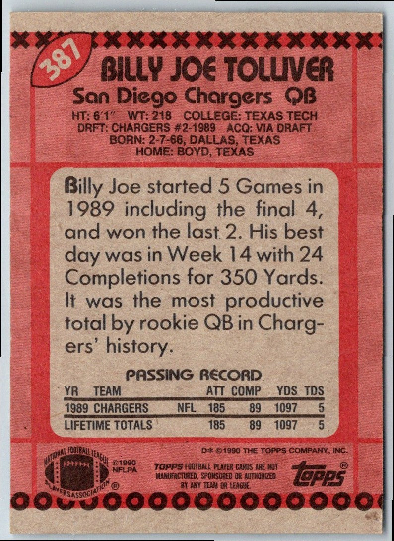 This 1990 Topps Billy Joe Tolliver #387 San Diego Chargers trading card is a must-have for any true fan of the Chargers and the NFL. Featuring a classic action shot of Tolliver in the pocket and a bright, vibrant design, it's sure to make a great addition to any collection. This card is the perfect way to commemorate the career of one of the NFL's greatest quarterbacks. Don't miss out on the chance to own a piece of football history!