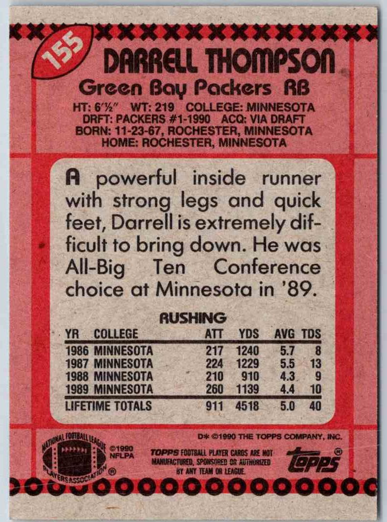 This 1990 Topps Darrell Thompson card #155 is a must-have for any serious sports card collector. Featuring an action-packed shot of the Minnesota Vikings All-Pro running back, this card captures the intensity and excitement of the game. With a vibrant color design and a glossy finish, this is an eye-catching piece that will surely stand out in your collection. Get this card to add a unique piece of sports history to your collection today.