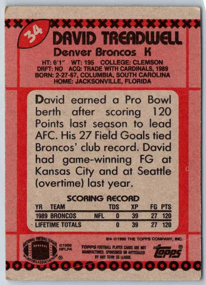 This 1990 Topps David Treadwell #34 card is a classic piece of sports memorabilia for football fans. Featuring a vibrant full-color image of the former standout NFL kicker, the card captures Treadwell in action as he prepares to send the ball sailing through the uprights. It's a fantastic piece of history and a great conversation starter for any sports collection.