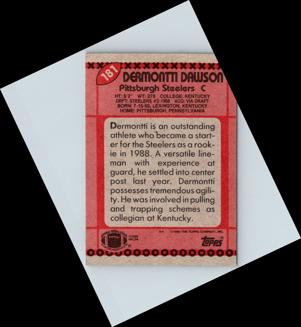 Dermontti Dawson was a star center for the Pittsburgh Steelers from 1988-2000. Now you can own a piece of Steelers history with the 1990 Topps Dermontti Dawson #181. This card features Dawson in action during his first season with the Steelers. It is a must-have for any Steelers fan, or any collector of NFL memorabilia. Show your Steelers pride and pick up this card today!