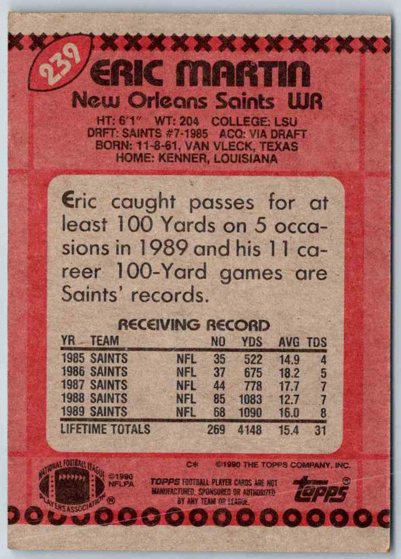 This 1990 Topps Eric Martin #239 card is a timeless piece of sports memorabilia. The card features a classic image of Martin, the former three-time Pro Bowl selection, in full action with the New Orleans Saints. The vibrant colors and sharp detail make this card a must-have for any Martin fan or collector. It is an important piece to any football collection and is sure to appreciate in value over time. Add this card to your collection today and own a piece of NFL history.