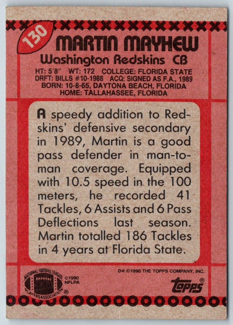 This 1990 Topps Martin Mayhew card #130 is a great collectible item for any Washington Redskins fan. The card features an action shot of Mayhew in his Redskins jersey and helmet. It is an excellent addition to any collection of sports memorabilia. The card is in Near Mint condition and is sure to be a treasured keepsake for years to come. Add this iconic piece of Redskins history to your collection today!