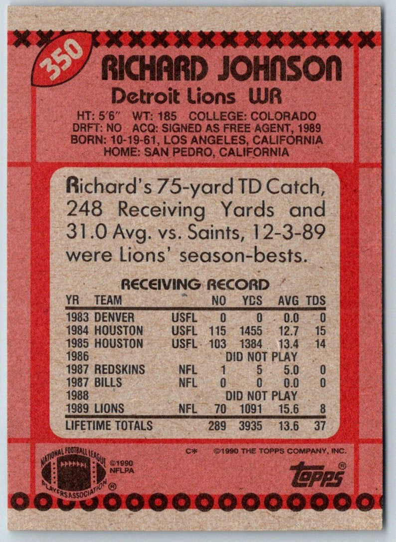 This 1990 Topps Richard Johnson #350 Detroit Lions football card is an absolute must-have for any Lions fan! Featuring Johnson in his classic Lions uniform, this card is sure to be a great addition to any NFL collection. Johnson was an integral part of the Lions team during his time with the franchise, and this card is the perfect way to pay homage to his impressive career. Show your support for the Lions, and add this card to your collection today!