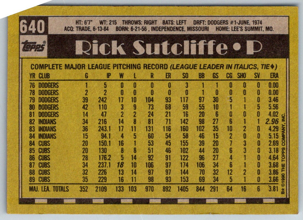 This 1990 Topps Rick Sutcliffe #640 Chicago Cubs card is the perfect addition to any fan's collection. Celebrate the Cubs' legendary pitcher with this stunning card featuring Sutcliffe in full Cubs uniform. The card is in near-mint condition, with sharp corners and a glossy finish. This card honors Sutcliffe's many accomplishments, including his All-Star selections in 1989 and 1990. Add this iconic card to your collection and celebrate a true Cubs great.