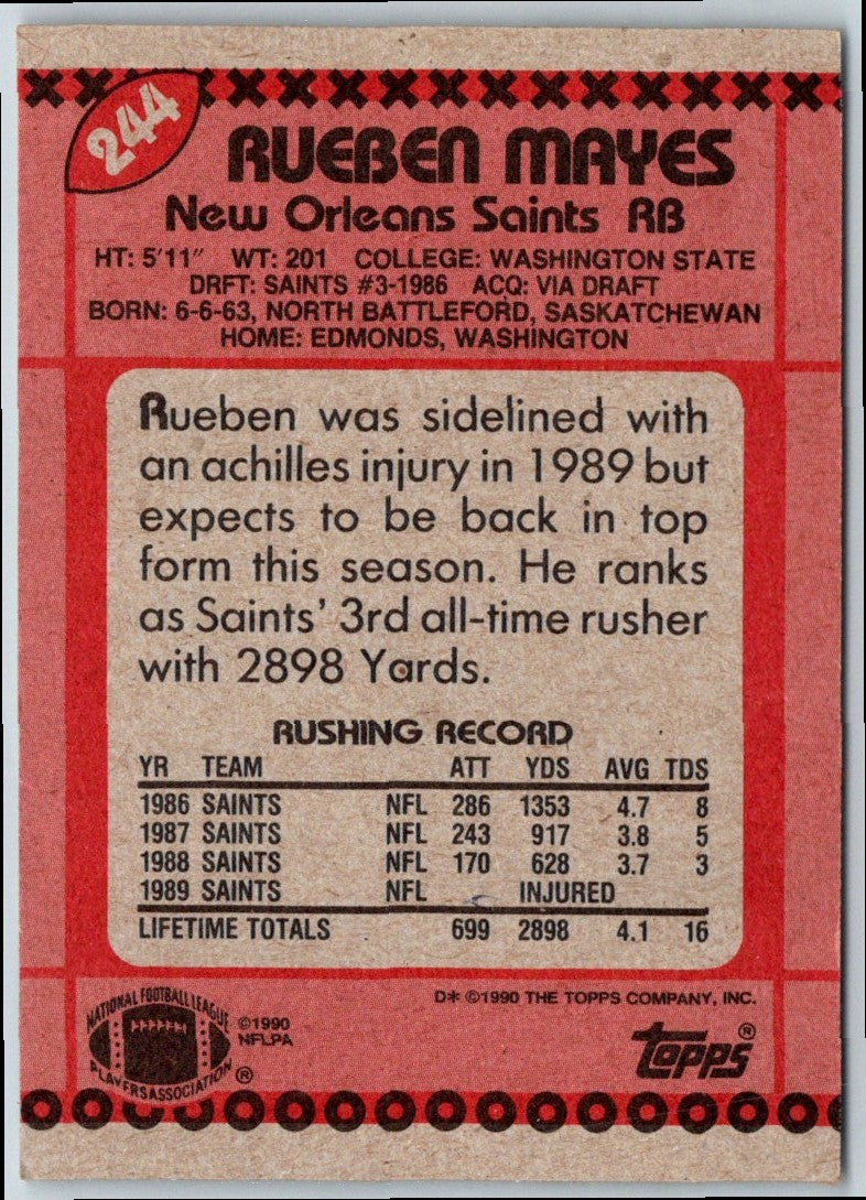 This 1990 Topps Rueben Mayes #244 New Orleans Saints card is the perfect way to honor one of the greatest running backs in the NFL. The card features a full-color image of Mayes in his Saints uniform, as well as detailed stats and career highlights on the back. This card is in near-mint condition and makes a great addition to any collection. Add this classic card to your collection today and remember one of the best Saints running backs of all time.