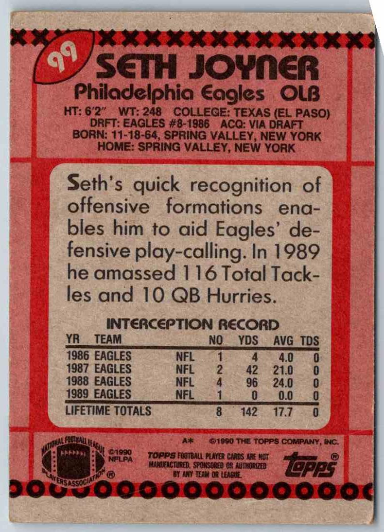 This 1990 Topps Seth Joyner #99 card is a must-have for any serious football collector! Featuring an iconic image of the former Philadelphia Eagle and Arizona Cardinal defensive star, this card captures Joyner's intensity and skill. The card is printed on glossy card stock, and the vivid colors and details bring the card to life. This card is a must for any collector looking to add a Pro Bowler to their collection. Add this card to your collection today and show your support for one of the top defensive players of the 1990s!