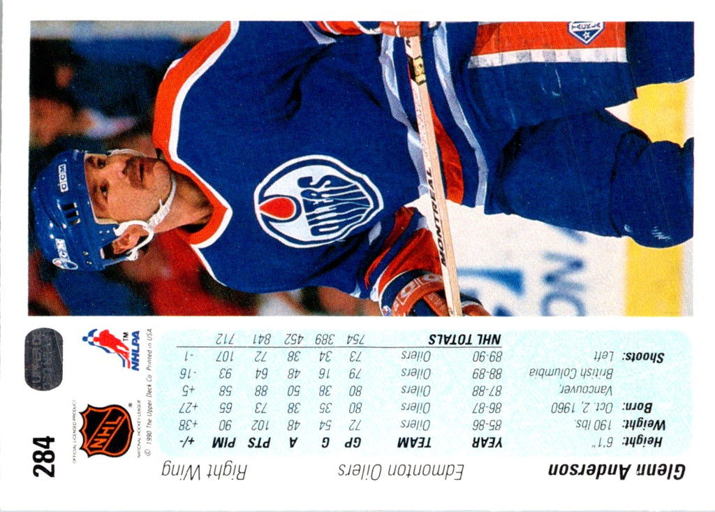 Glenn Anderson was one of the most prolific goal-scorers in the NHL during the 1980s and 1990s and is an Edmonton Oilers legend. This 1990 Upper Deck card captures Anderson in his Edmonton Oilers uniform and is sure to be a great addition to any hockey fan's collection. It features Anderson in mid-stride, with his classic moustache and all-black Oilers gear. With its vibrant colors and crisp details, this card is perfect for any Edmonton Oilers fan looking to add a bit of nostalgia to their collection. Don't miss out on your chance to own this iconic piece of hockey history!