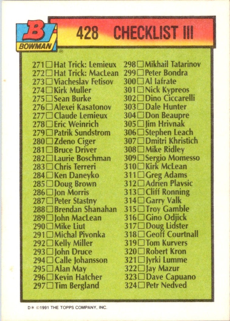 This 1991 Bowman Checklist #428 is a must-have for all sports card collectors. This card features a full checklist of the 1991 Bowman set, ensuring you have a complete collection. The checklist is printed in full color on premium card stock, making it a great addition to any collection. It also features a photo of a young Ken Griffey Jr., making it a great way to commemorate one of the greatest players to ever play the game. Add this card to your collection today!