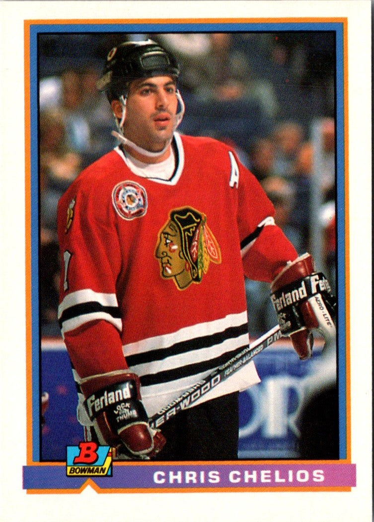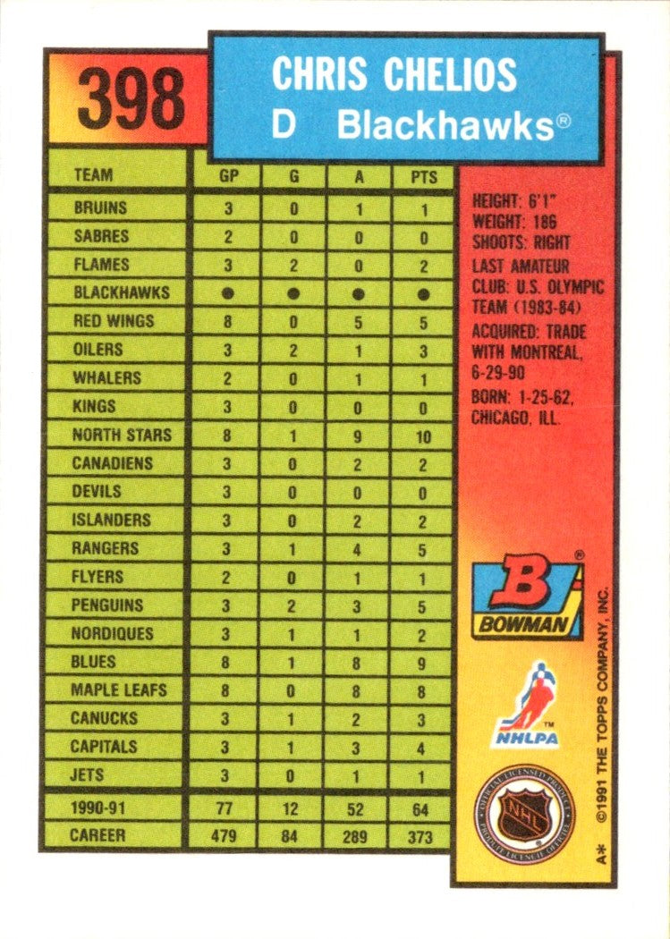 This 1991 Bowman Chris Chelios #398 card is a great addition to any hockey fan's collection! The card features a full-color glossy photo of the Blackhawks star on the front, with his name, team, and position printed on the back. This card is a perfect way to honor one of the greatest defensemen in NHL history. Add this card to your collection and you'll have a lasting reminder of the incredible career of Chris Chelios!