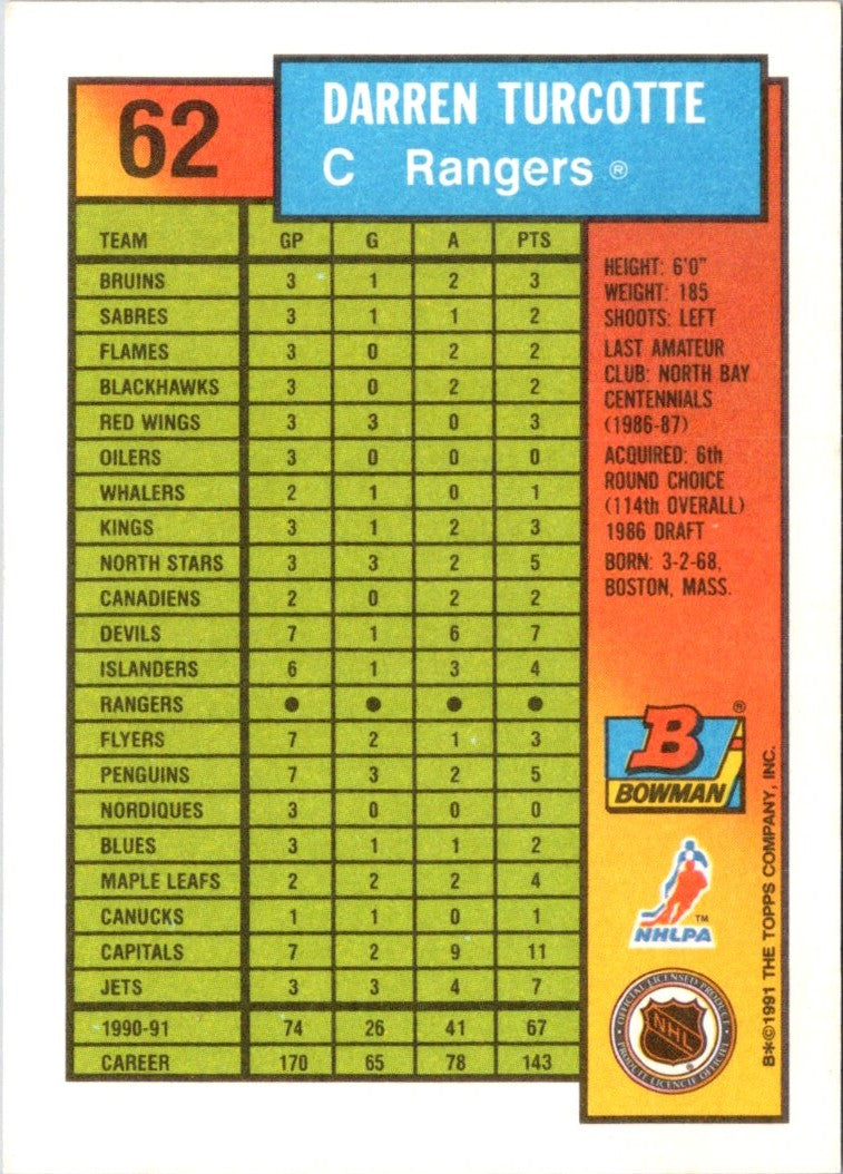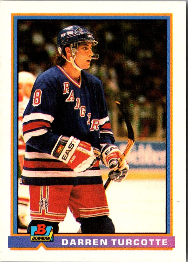 This 1991 Bowman Darren Turcotte #62 card celebrates the New York Rangers great forward. Turcotte had an impressive career in the NHL, playing 11 seasons with the Rangers, Whalers, Stars, and Jets. This card is a must-have for any serious hockey collector or New York Rangers fan. The card features a photo of Turcotte in action in his Rangers uniform, and the back of the card features his complete career stats. Add this card to your collection today and celebrate the career of one of the NHL's greats!