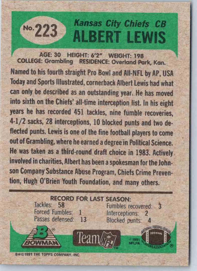 This 1991 Bowman Football Albert Lewis #223 card is a great addition to any collection. Featuring a vibrant, full-color image of Lewis in his Kansas City Chiefs uniform, this card is sure to bring back memories of his Hall of Fame career. The card is also in mint condition, ensuring its value and collectibility for years to come. Don't miss your chance to own this piece of NFL history!