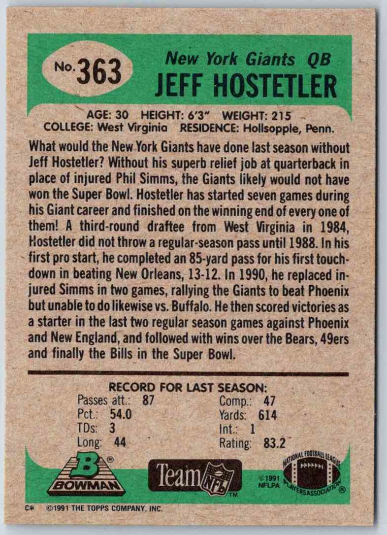 The 1991 Bowman Football Jeff Hostetler #363 card is an essential addition to any serious football card collector's collection. This card commemorates the outstanding career of the former New York Giants quarterback, Jeff Hostetler. As a two-time Super Bowl Champion and Pro Bowl selection, Hostetler was one of the most successful NFL quarterbacks of his era. The card features a full-color action photo of Hostetler, with an in-depth biography on the back. Own a piece of football history and add the 1991 Bowman Football Jeff Hostetler #363 card to your collection today!