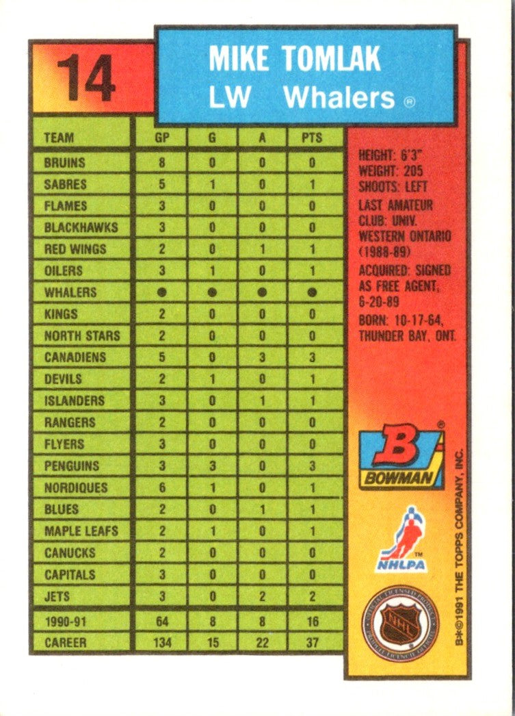 This 1991 Bowman Mike Tomlak #14 Hartford Whalers card is the perfect addition for any hockey fan's collection. Featuring a detailed image of Tomlak on a vibrant background, this card captures the energy of the game. Perfect for any Whalers fan or card collector, this card is sure to be a valuable and cherished piece. Add this iconic card to your collection today!