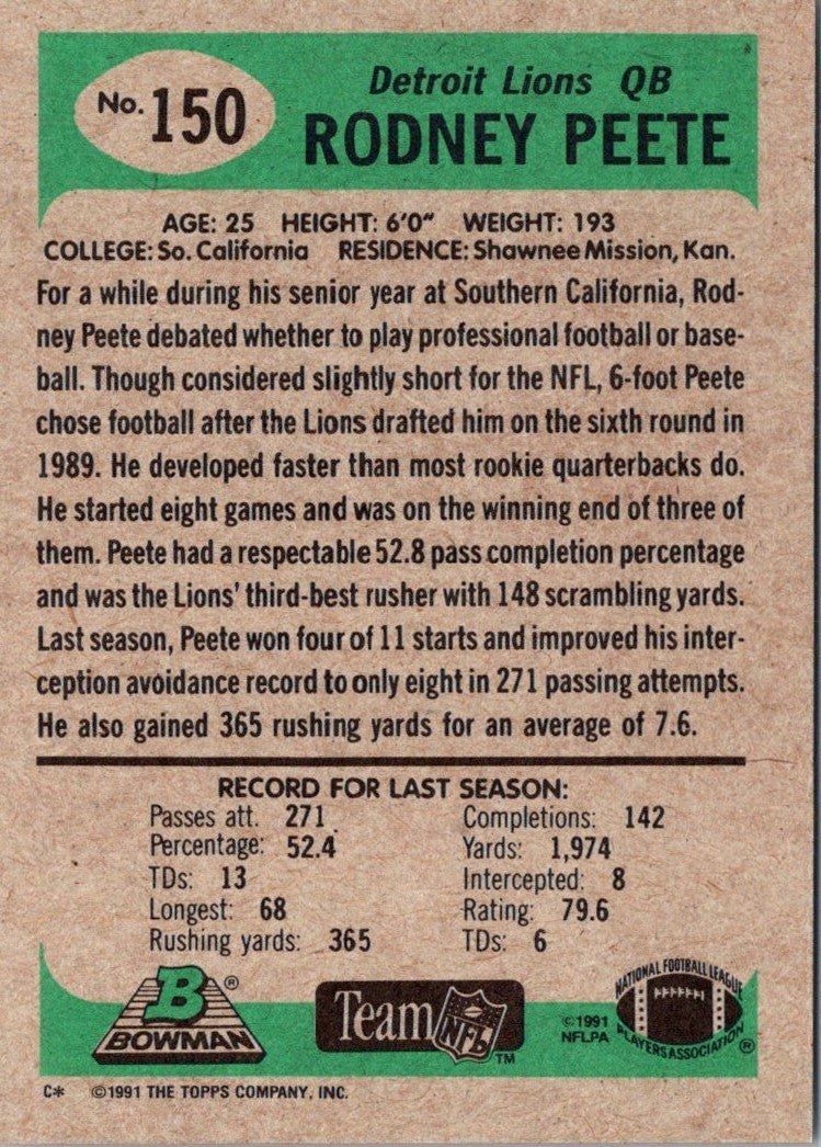This 1991 Bowman Rodney Peete #150 card from the Detroit Lions is a must-have for any fan of the team. The card features an iconic image of Peete in his Lions uniform, ready to take the field. It is printed on glossy cardstock and has a unique design that is sure to stand out in any collection. Plus, with a Beckett Grading system rating of 8 NM-MT, it is sure to remain in pristine condition for years to come. Show your support for the Detroit Lions and add this card to your collection today!