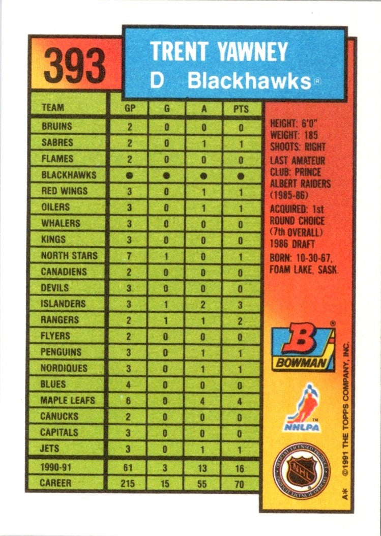 This 1991 Bowman Trent Yawney #393 trading card from the Chicago Blackhawks is a must-have for any hockey fan! Featuring a glossy, full-color action shot on the front, and Yawney's career stats and biography on the back, this collectible card is perfect for any collection. This card is sure to bring back memories of Yawney's career with the Blackhawks and make a great addition to any hockey memorabilia collection. Get your hands on this card and add it to your collection today!