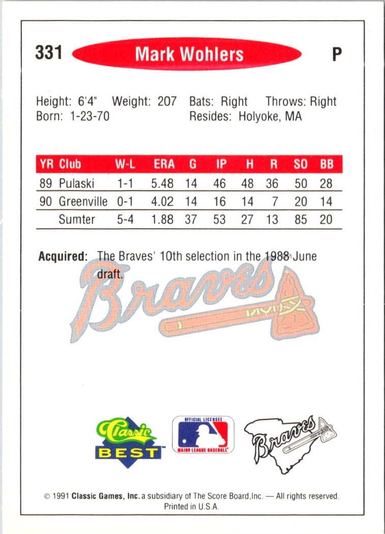 This 1991 Classic Best Mark Wohlers #331 Greenville Braves card is a great addition to any baseball fan's collection. Featuring a classic Braves logo, this card is sure to be an eye-catcher. With a professional-level photo of Wohlers in action, this card will make a great addition to any collection. The vibrant colors and crisp details will make this card stand out in any collection. Add this card to your collection and show your support for the great Mark Wohlers and the Greenville Braves!