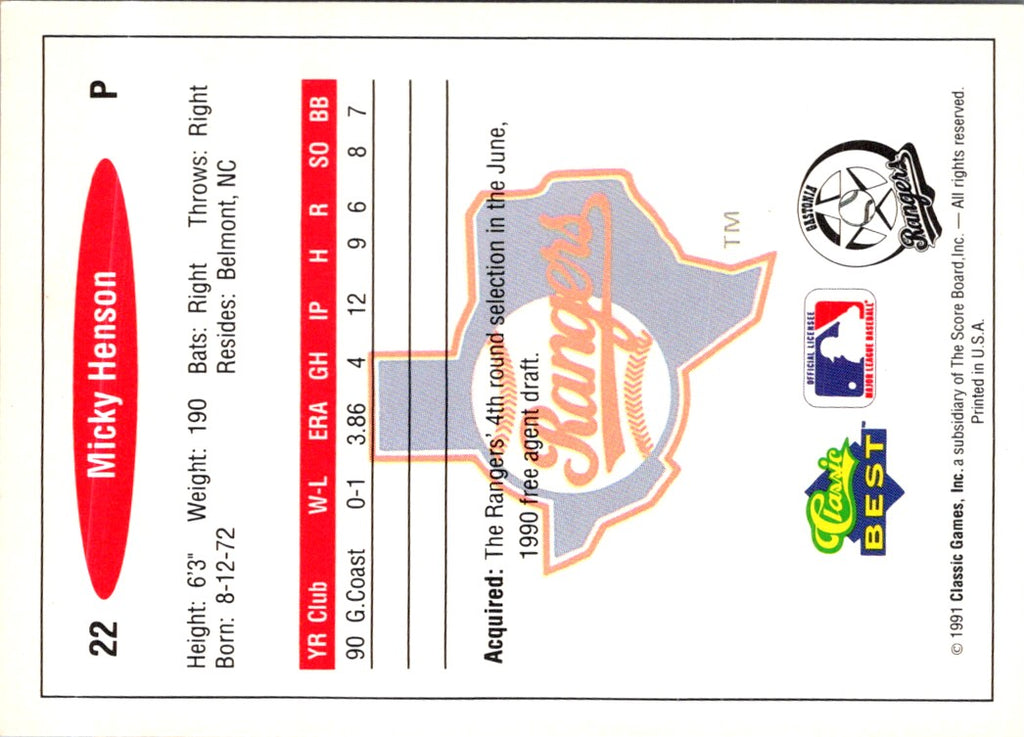 This 1991 Classic Best Micky Henson #22Gastonia Rangers card is a must-have for any sports card collector. This card is in great condition and features an image of Micky Henson in action. The card captures the spirit of the player and the team at the time, and would make a great addition to any collection. This card is an affordable way to add some great baseball history to your collection.