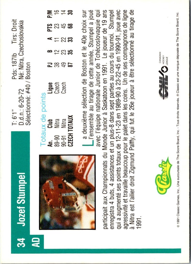 This 1991 classic draft pick of Jozef Stumpel #34 from the Boston Bruins is a must-have item for any hockey fan. Featuring a classic black and gold Bruins logo, this collectible card is a great way to show your Bruins pride. With a classic design, this card is sure to look great in any collection. Whether you're a die-hard fan or a casual collector, this card is a great way to celebrate the career of one of the NHL's best players. Whether you're looking to add to your collection or give a gift to a fellow fan, this card is sure to make a great addition.