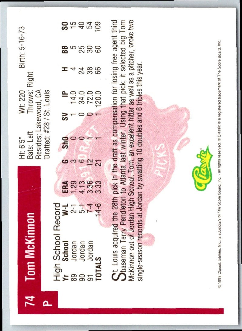 This 1991 Classic Draft Pick Tom McKinnon #24 St. Louis Cardinals card is a must-have for any Cardinals fan or baseball card collector. The card shows McKinnon in a classic Cardinals uniform, ready to take the field. With a glossy finish and full-color action photo, this card is sure to become an eye-catching addition to any collection. McKinnon, drafted in 1991, played as a relief pitcher for the Cardinals until 1996. This card is a great reminder of his career with the Cardinals, and is a perfect way to honor a beloved player. Add this card to your collection today and remember the great career of Tom McKinnon.