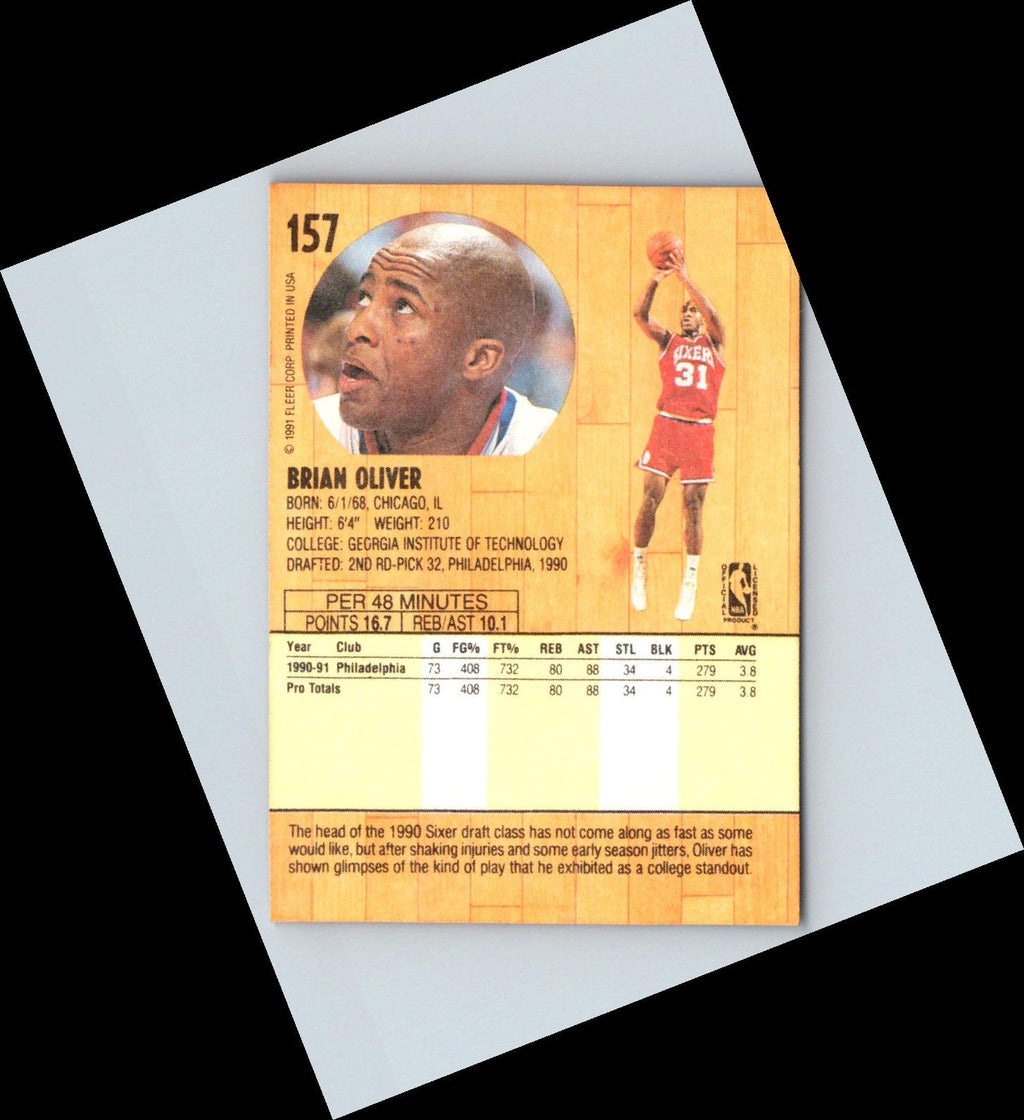 This 1991 Fleer Brian Oliver #157 Philadelphia 76ers card is a must-have for any collector of basketball cards. Featuring a dynamic image of Oliver in his 76ers uniform, this card is sure to be a great addition to any fan's collection. With vibrant colors and sharp details, this card is sure to please any fan of the Philadelphia 76ers. Add it to your collection today and show your support for Brian Oliver and the 76ers!