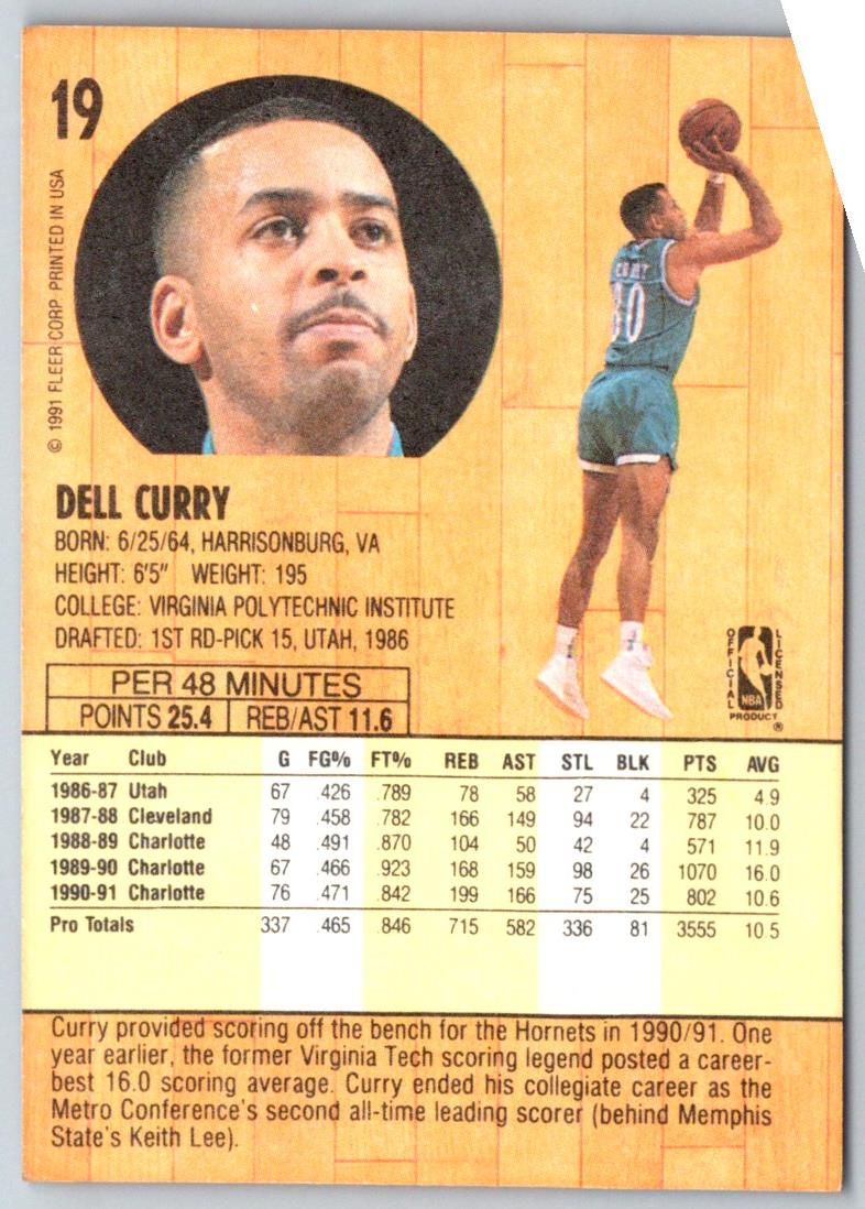 This 1991 Fleer Dell Curry #19 Charlotte Hornets card is a must-have for any collector. It features an action shot of Dell Curry in his Hornets jersey, along with his full name and number. It's a great way to show your support for the Charlotte Hornets and show your admiration for the Curry family. This card is in near mint condition and is a great addition to any collection. Don't miss out on this great card!