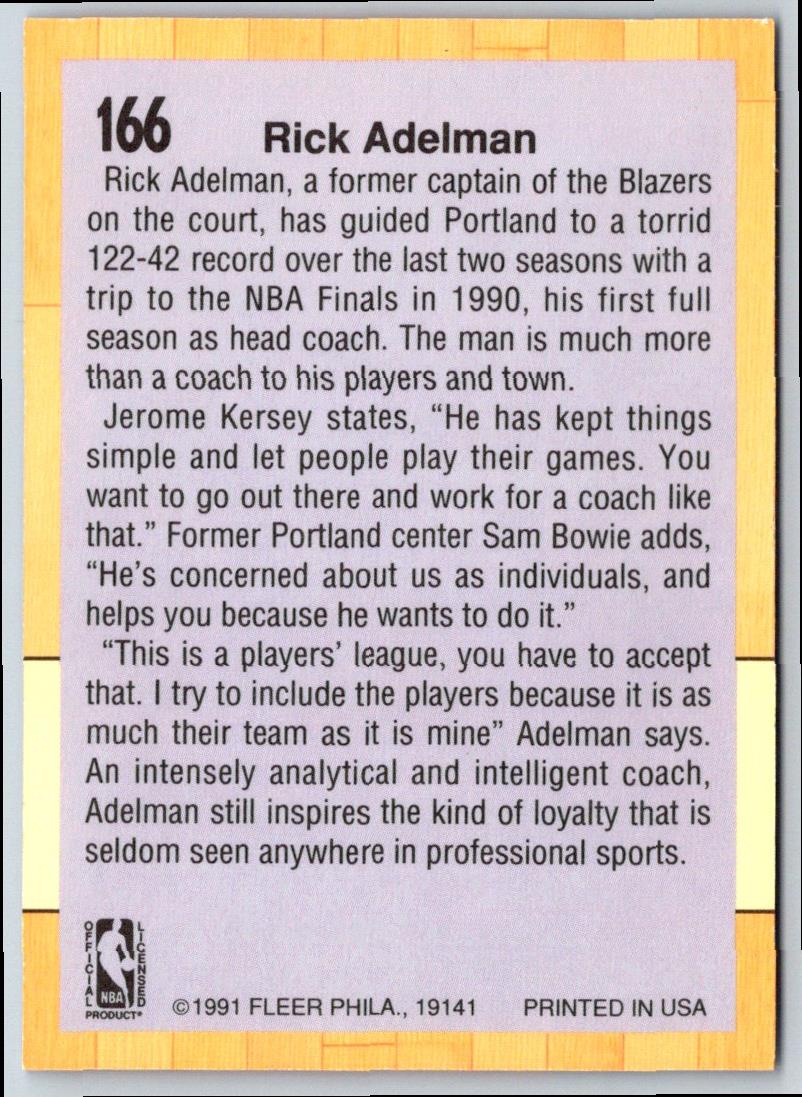 Fleer Rick Adelman #166 Portland Trail Blazers card is a great collectible for any basketball fan. This card features a portrait of Adelman in his Trail Blazers uniform, along with career stats and awards, including three All-Star appearances and one NBA Championship in 1990. It is a perfect way to pay tribute to the Hall of Fame coach and Trail Blazers legend. This card is sure to be a cherished part of any collection. Add this classic card to your collection today!