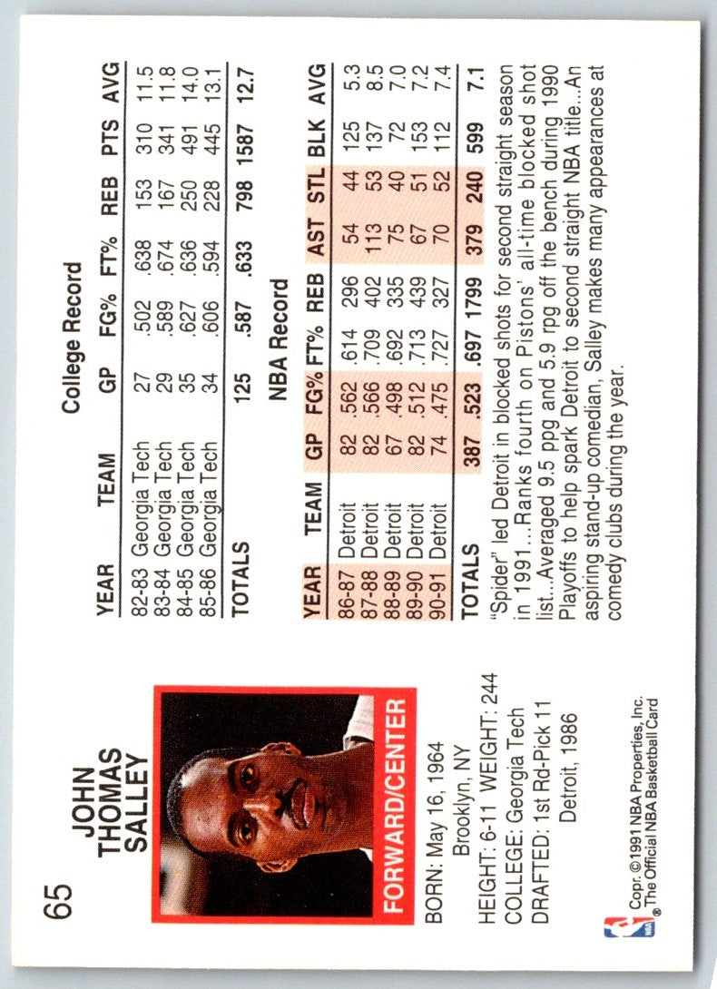 This 1991 Hoops John Salley #65 Detroit Pistons card is a must-have for any basketball card collector. Showcasing the authentic Pistons uniform and colorful action shot, this card captures Salley's time with the Pistons perfectly. Featuring a glossy finish, this card is sure to be a standout in any collection. A great addition to any Pistons or basketball fan's collection, this card is sure to be a great investment.