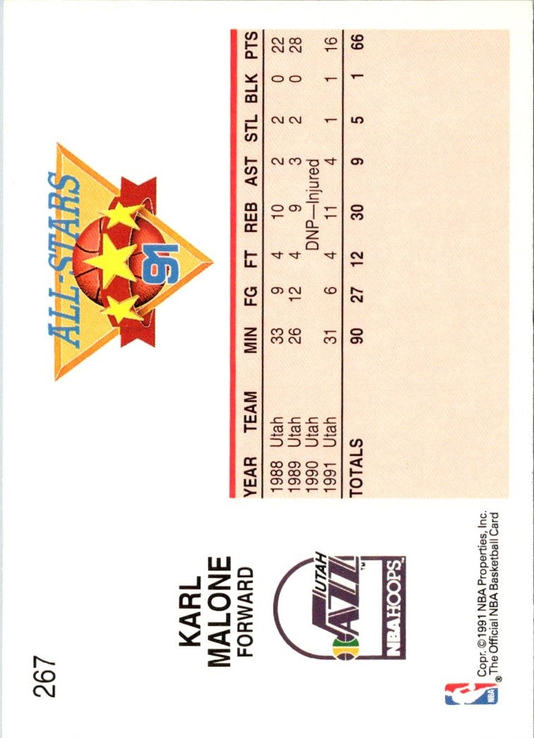 The 1991 Hoops Karl Malone #267 Utah Jazz card is a classic basketball card that any fan of the Utah Jazz or Karl Malone must have in their collection. Featuring a high-quality image of the legendary star in his Jazz uniform, this card is a must-have for any basketball card collector. It features detailed stats and bio information on the back, making it a fun and interesting piece of memorabilia. Whether you're a diehard Utah Jazz fan or just an admirer of the legendary Karl Malone, the 1991 Hoops Karl Malone #267 Utah Jazz card is an essential piece of basketball history.