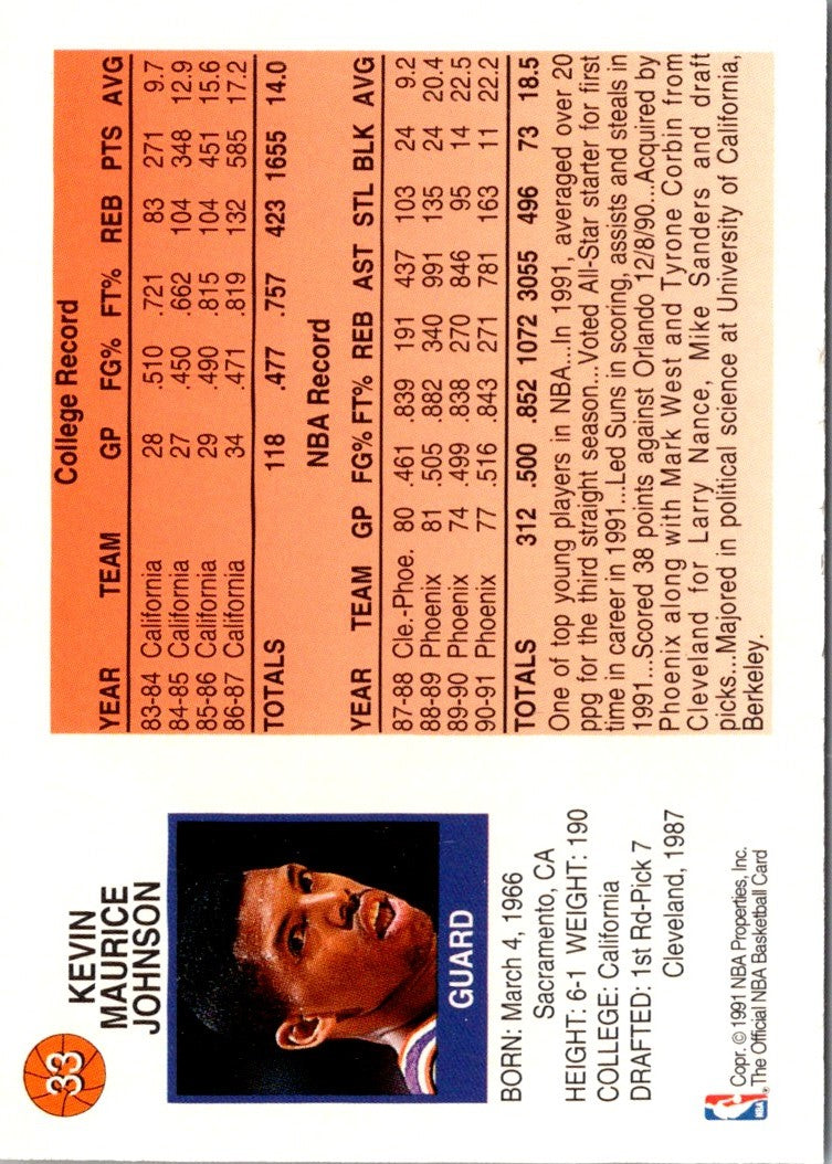 At 6'1" and 175 lbs, Kevin Johnson was one of the most explosive point guards in the NBA during the early 1990s. His #33 Phoenix Suns jersey from 1991 is a must-have for any true basketball fan. With its classic Suns logo, bright orange and purple colors, and Johnson's name and number in crisp, vibrant white lettering, this jersey is sure to make a statement in any collection. It's the perfect way to show your support for one of the NBA's all-time greats!