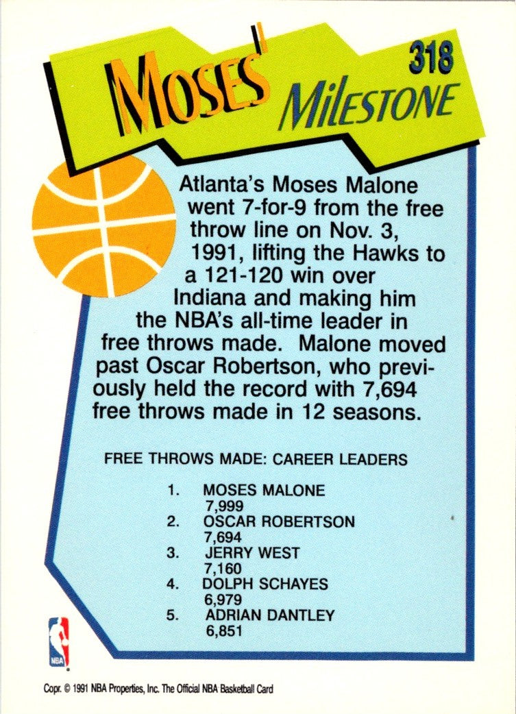 This 1991 Hoops Moses Malone #318Atlanta Hawks card is a great way to add a classic piece to your basketball card collection. Featuring a great action shot of Malone in his Atlanta Hawks jersey, this card is sure to be a hit with any basketball fan. It's a perfect addition to any collection and a great way to show your appreciation for one of the greatest players of all time. Add it to your collection today!