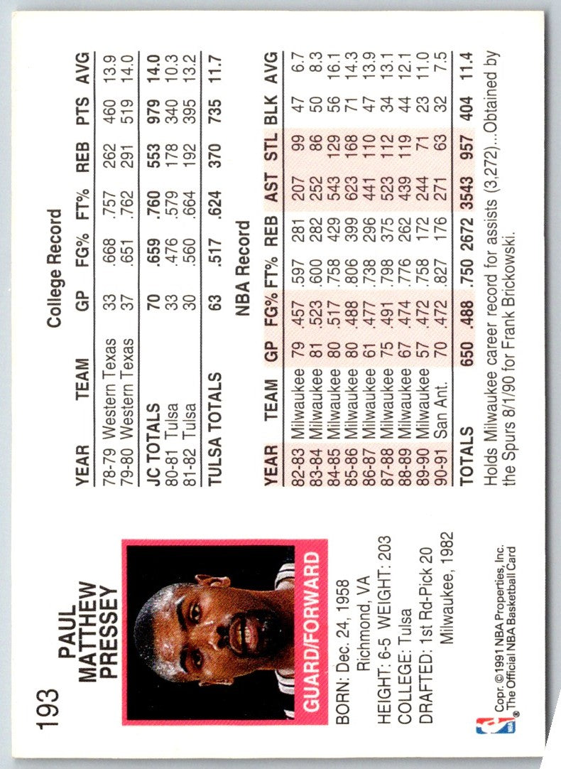 This 1991 Hoops Paul Pressey #193 San Antonio Spurs card is an absolute must have for the true basketball fan. Featuring a vivid representation of the professional player, this card is sure to please both the casual and the hardcore collector. With vibrant colors and a sleek design, this card is sure to be the centerpiece of any collection. Add this card to your collection today, and enjoy the memories of one of the great players of the 1990s.