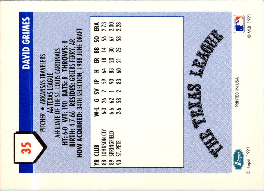 This 1991 Line Drive AA David Grimes #35 Arkansas Travelers card is the perfect addition to your ever growing collection of sports memorabilia! This card features a high quality image of Grimes in action on the field! With bright colors and sharp details, this card is sure to stand out amongst your collection! This card is sure to be a great conversation starter and the perfect piece to display in any man cave or game room! Add this card to your collection today and be sure to show off your team spirit!