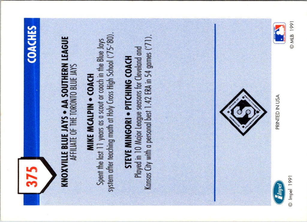 Description: 1991 Line Drive AA Mike McAlpin/Steve Mingori #375