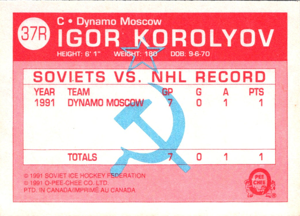 1991 O-Pee-Chee Central Red Army Igor Korolev #37R