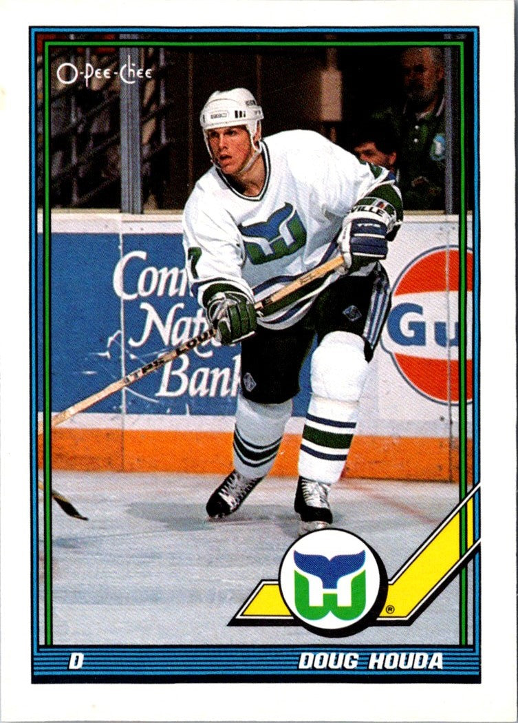This 1991 O-Pee-Chee Doug Houda #512 card features a great action shot of the Hartford Whalers defenseman. A great addition to any hockey fan's collection, this card is in near-mint condition, with sharp corners and vibrant colors. It's a must-have for any Whalers fan, or any fan of the greatest hockey players of all time. Add it to your collection today and show your pride for the Whalers.