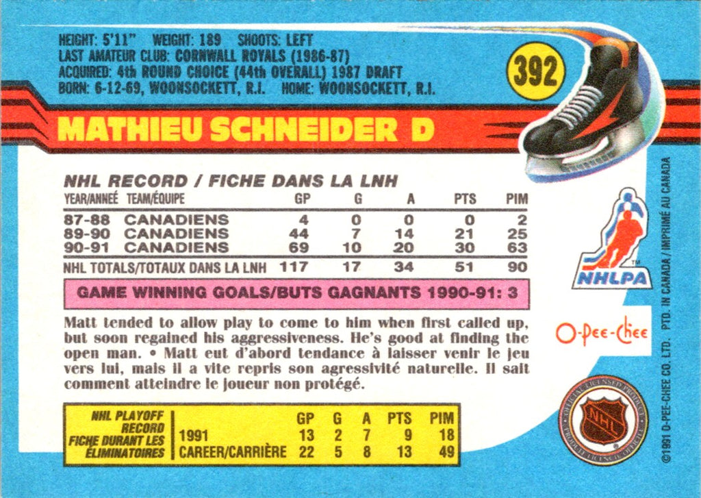 This 1991 O-Pee-Chee Mathieu Schneider #392 Montreal Canadiens card is the perfect way to commemorate one of the most iconic Canadiens teams of all time. Featuring a vibrant team photo of Schneider in his signature blue and white jersey, this card is an excellent way to honor this legendary player and show your support for the Canadiens. With sharp details and colors, it makes a great addition to any collection. Add this card to your collection today and show your support for the Canadiens and Mathieu Schneider!